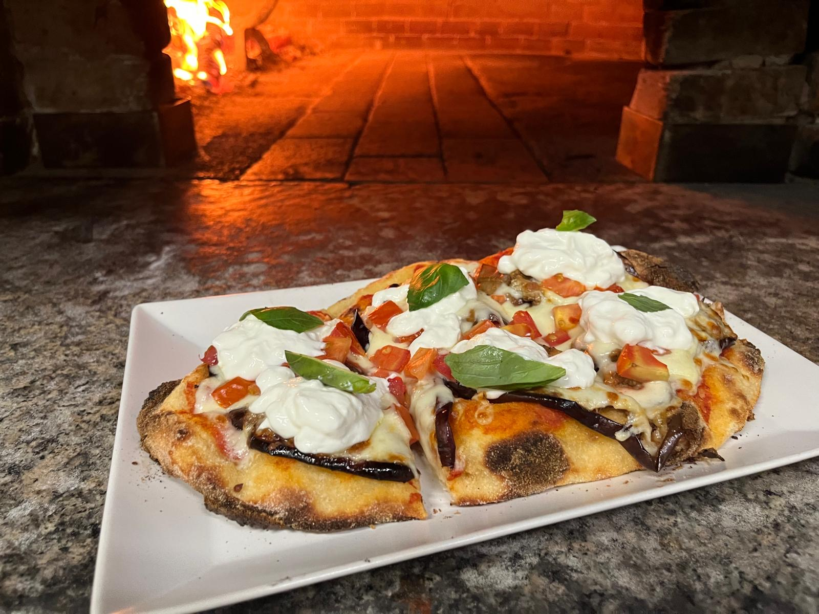 pomodoro, mozzarella, salsiccia piccante, pecorino, melanzane fritte