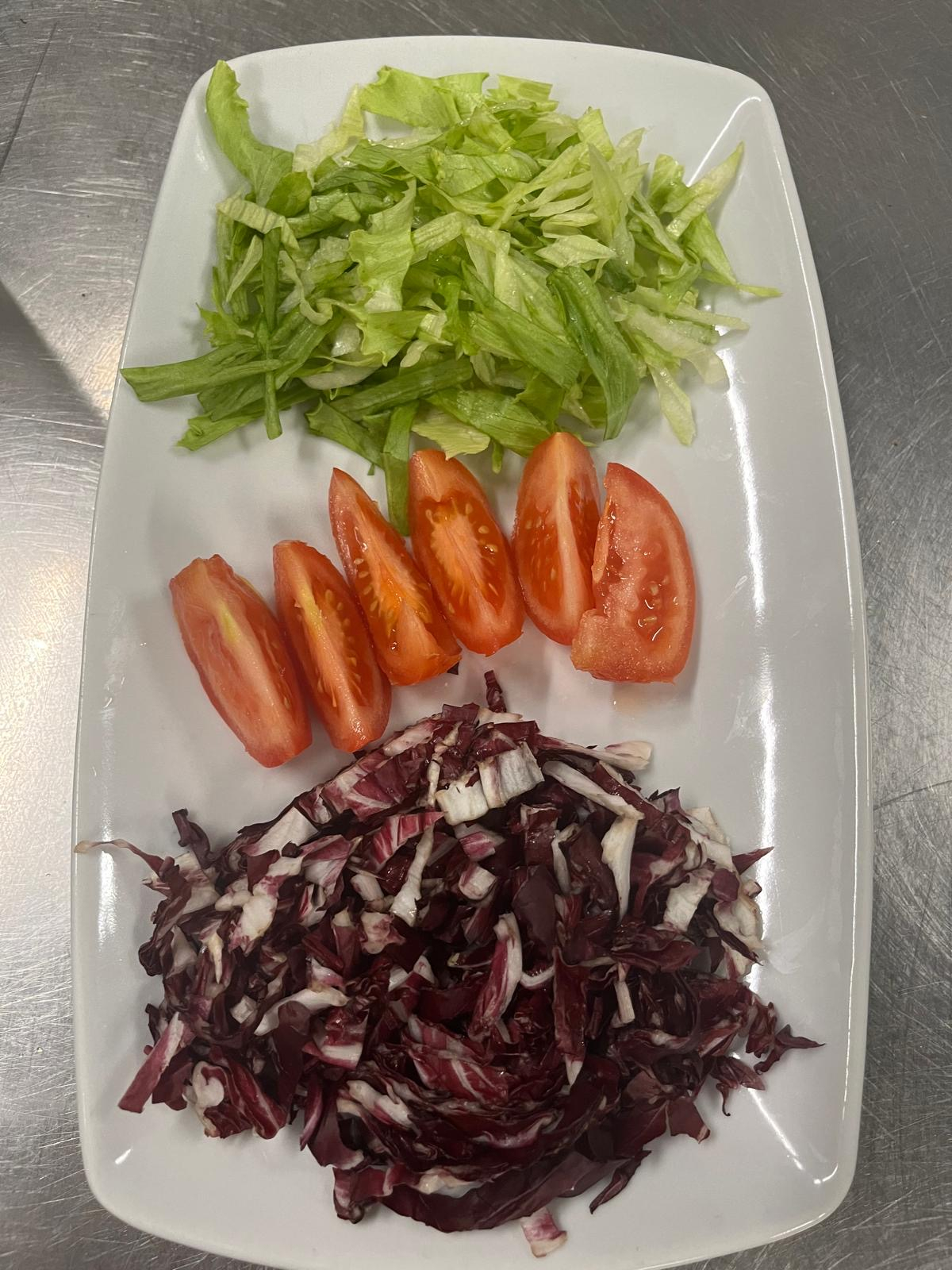base di crema di verdura, melanzane fritte, funghi trifolati, pomodoro fresco, olive taggiasche