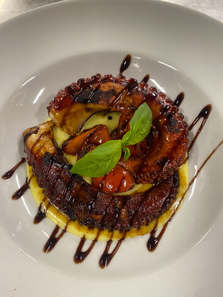 Polpo arrostito su crema di patate allo zafferano e glassa di aceto balsamico
